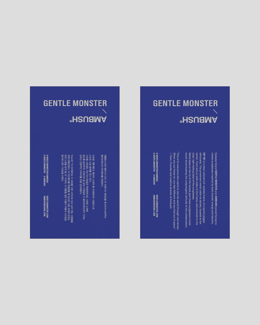 ジェントルモンスターとアンブッシュの初のコラボレーションにおいて、パッケージ、グラフィックアイデンティティ、ポップアップイベントスペースのグラフィックデザインを手がけました。アンブッシュ東京旗艦店のサインからインスピレーションを受け、縦型のコラボレーションロゴをデザインし、このロゴを活用したサングラスアクセサリーもデザインしました。ショーケースに展示されたサングラスの姿をパッケージデザインに反映させることを目指し、完成したパッケージは空間のデコレーション要素としても活用されました。ポップアップイベントは東京とソウルで開催され、イベントスペースのグラフィックや招待状、プレスキット、サインなどもデザインしました。