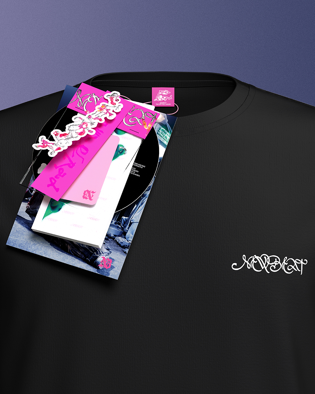 NEWBEAT의 굿즈 및 패키지 그래픽 디자인을 진행했습니다. 패키지는 멤버별 상징 일러스트가 적용된 티셔츠를 중심으로 구성되었으며, 각 구성품은 택(tag) 형태의 그래픽 요소로 풀어내 티셔츠 굿즈의 콘셉트와 방향성을 시각적으로 강화했습니다.