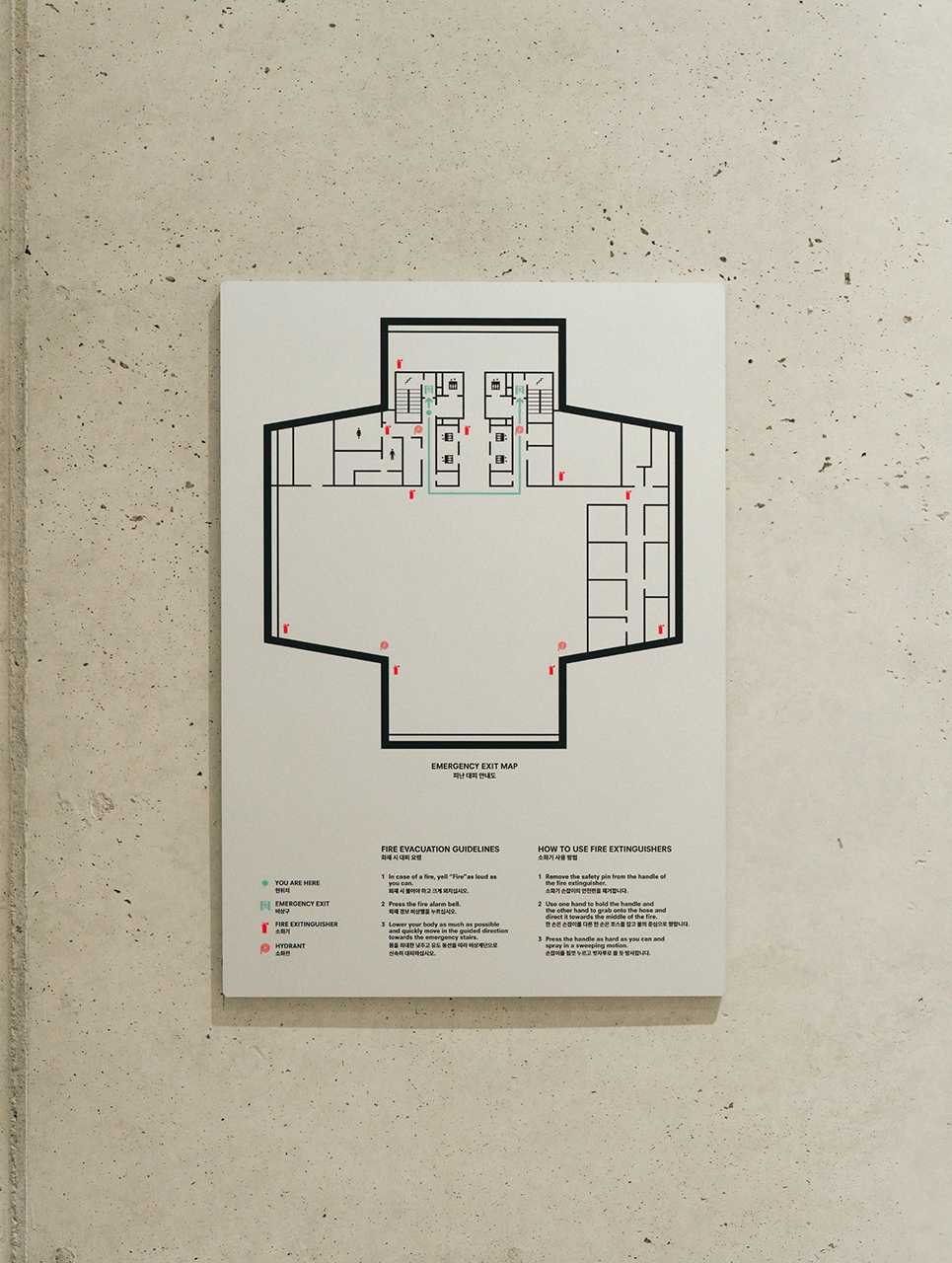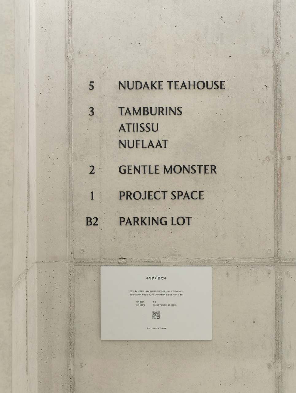 HAUS NOWHERE SEOUL is a mixed-use space housing the brands GENTLE MONSTER, TAMBURINS, NUDAKE, ATIISSU, and Nuflaat, together with IICOMBINED’s offices, spanning from five basement levels to fourteen floors above ground. The signage graphics were developed to align with the tone of the space, prioritizing clarity and visual consistency through a considered information hierarchy and graphic layout. The graphics support intuitive spatial recognition and navigation across the building by responding to floor composition and circulation. Client: IICOMBINED Creative Direction: GENTLE MONSTER (TAESEOK PARK, JAEKYEONG LEE, RAYOUN HWANG) Lead Graphic Designer: HEEWON LEE Assistant Graphic Designer: SUNGMIN LEE Photography: YI LAKYEOM